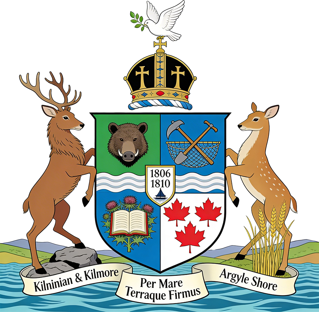 The McPhail Coat of Arms reflects both the Scottish heritage of the McPhail family and its Canadian roots in Prince Edward Island. The family's Canadian lineage begins with Rev. Donald McPhail, who immigrated from the Isle of Mull, Scotland, in 1810 at approximately eleven years of age. He later married Mary Currie, who had arrived in Prince Edward Island with her family in 1806. This branch of the McPhail family traces its origins in Canada to this union.